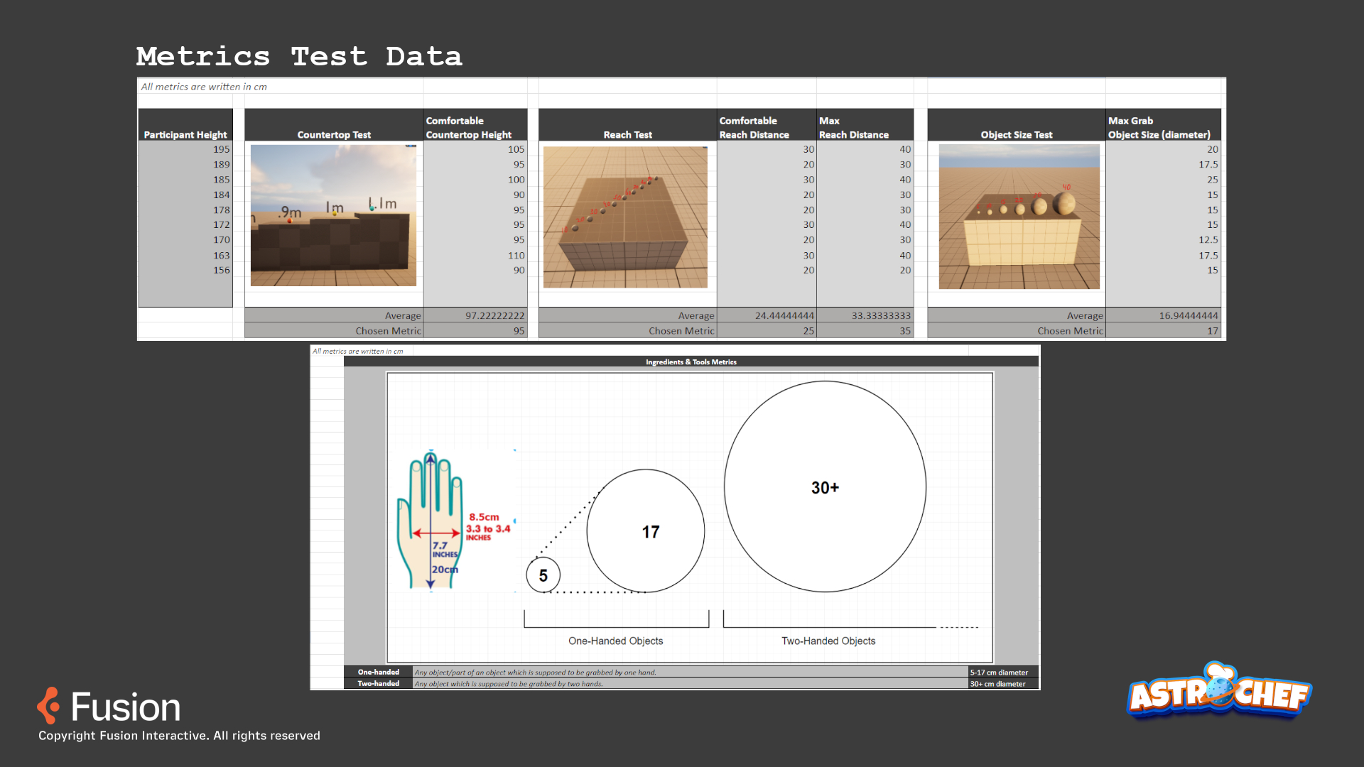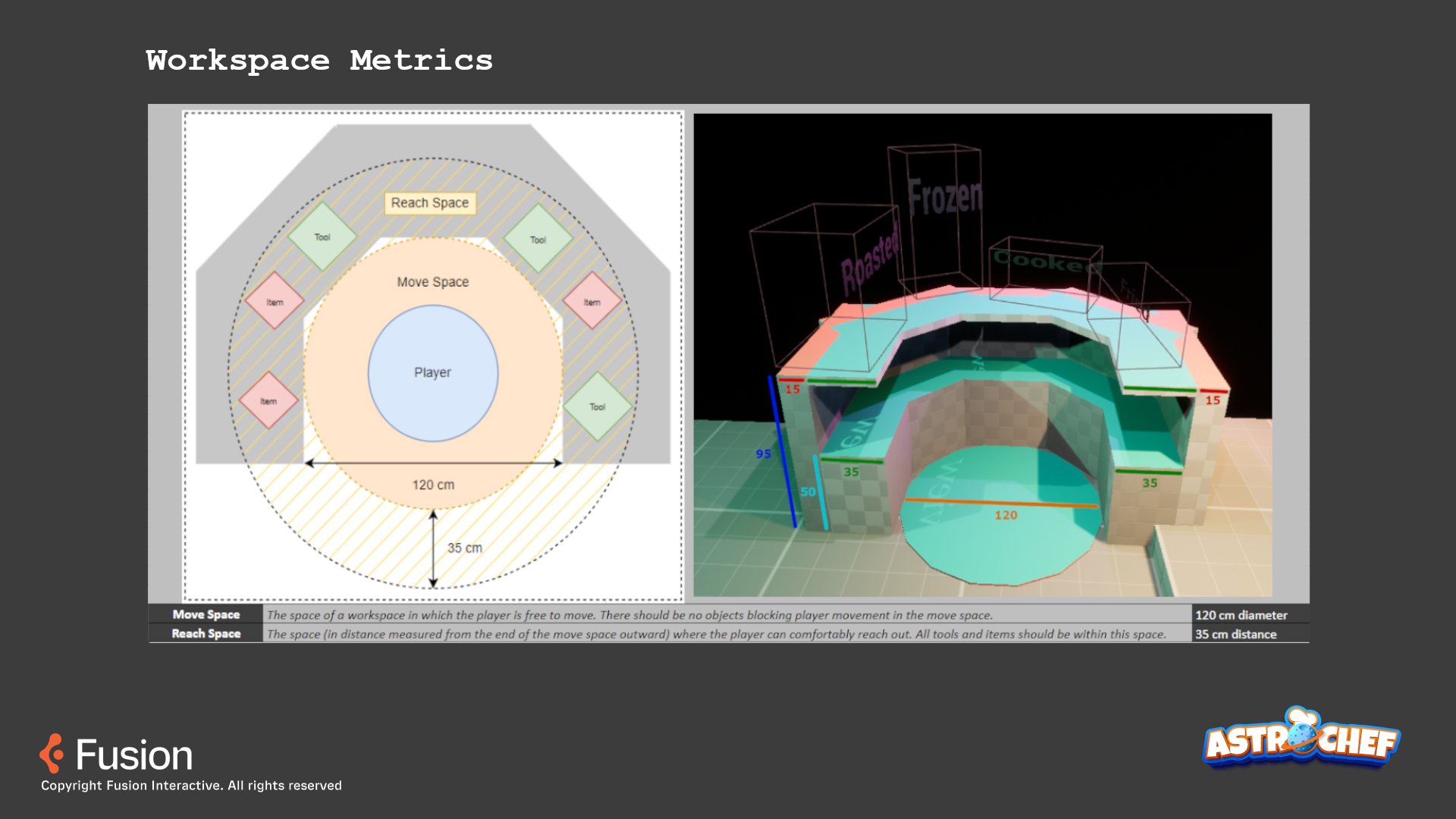 To ensure the accessibility of all mechanics within the workspaces to players of any height or age, I established the base metrics based on a small test. I created a VR scene in which testers of varied heights had to reach out to objects at varying distances, heights and size. Based on their comfortability, an ideal “goldilocks zone” for kitchen counter height, distance from player position, and object size for mechanics was established.