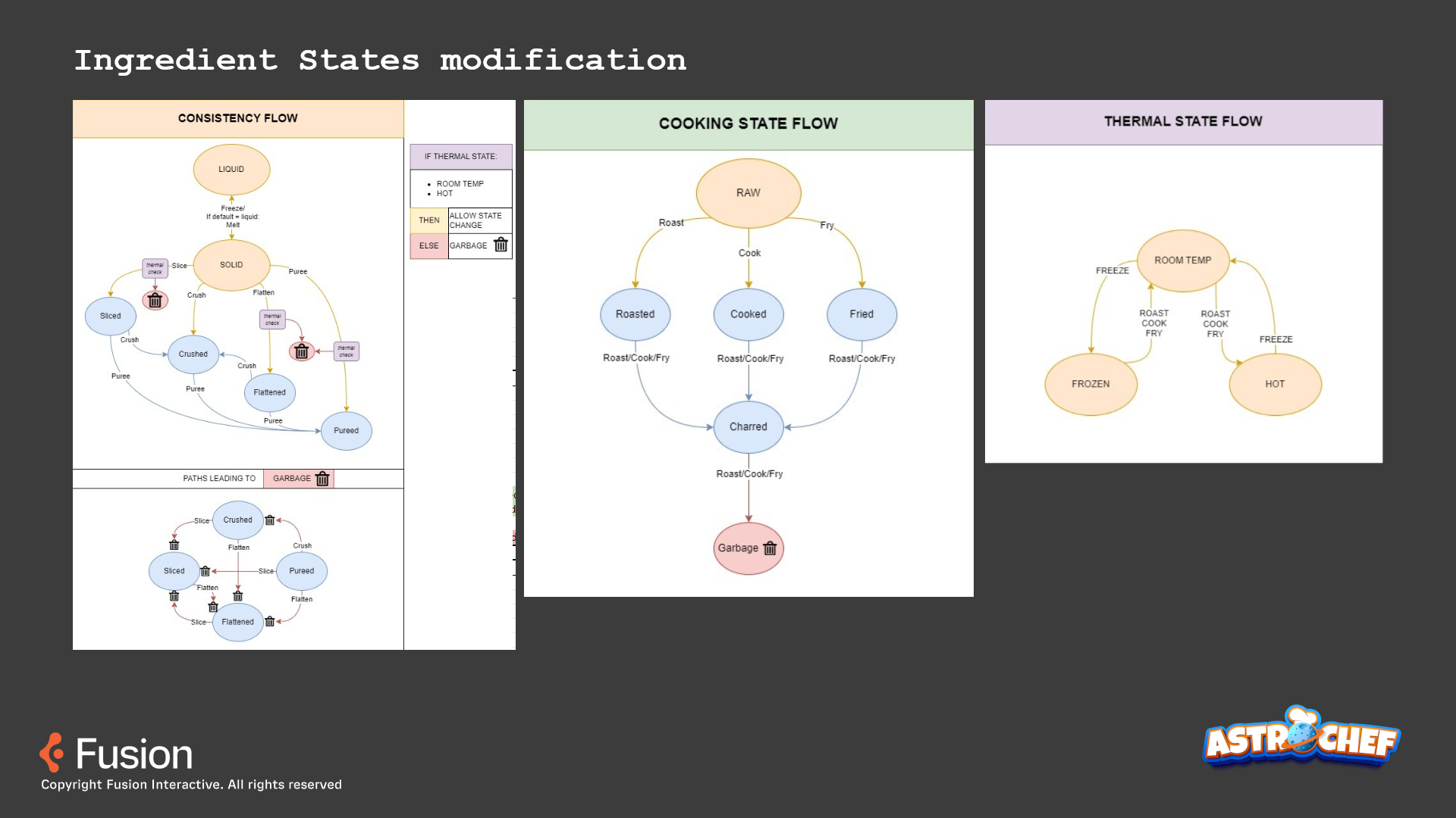 In this case three different categories of states; consistency states, cooking states, and thermal states. Each tool would adjust one or more of these state categories to their corresponding state. However, depending on which states an ingredient was in, it could also lead to failure, the trash state.