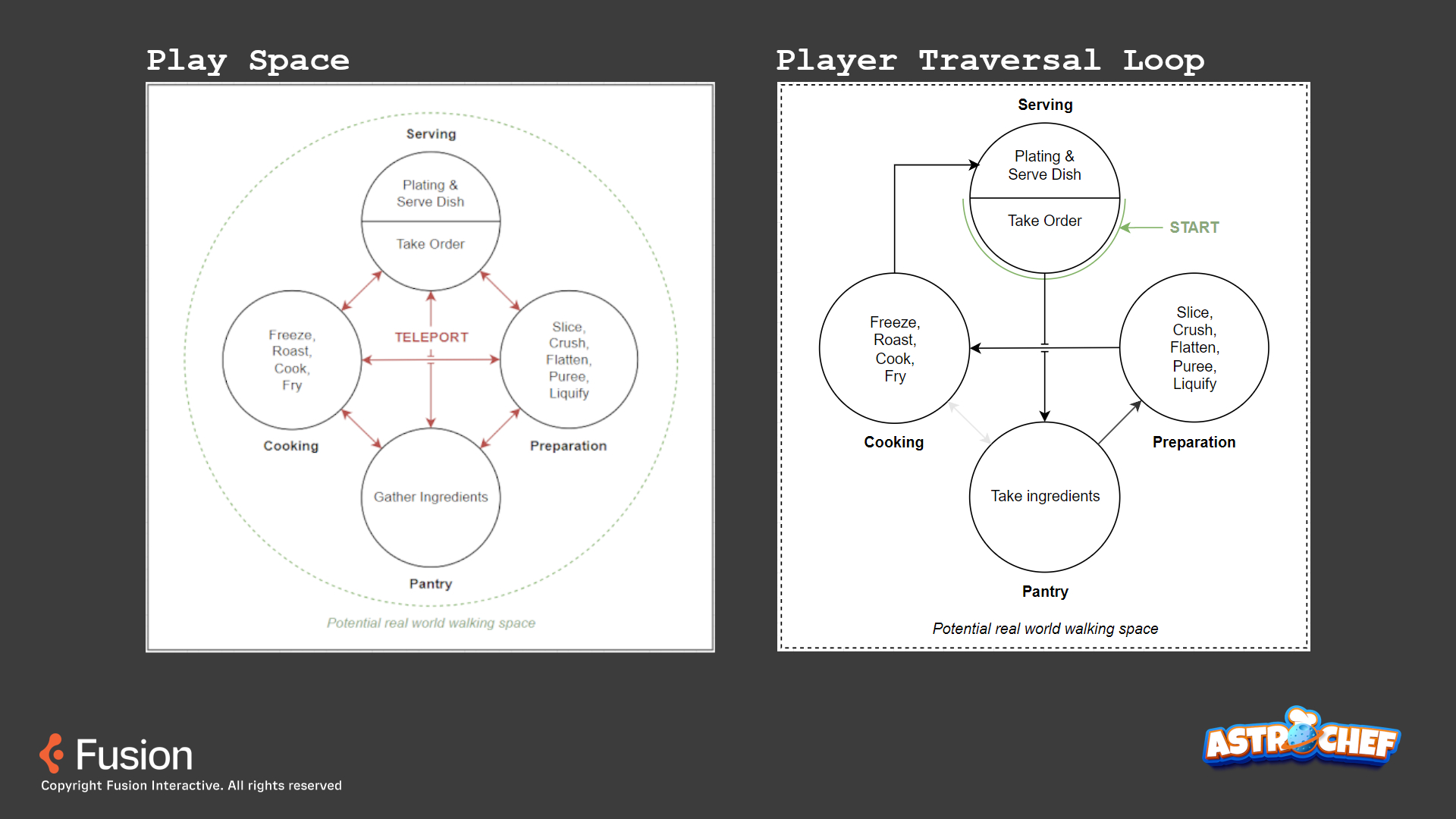 The player’s main mode of transportation within VR would be teleportation, therefore we chose for a “workspaces” solution. Grouping mechanics of a similar type within reach of a single teleport point. These workspaces were laid out in a manner that would support the logical gameplay progression and traversal from ‘getting ingredients’ all the way to ‘serving the final dish’.