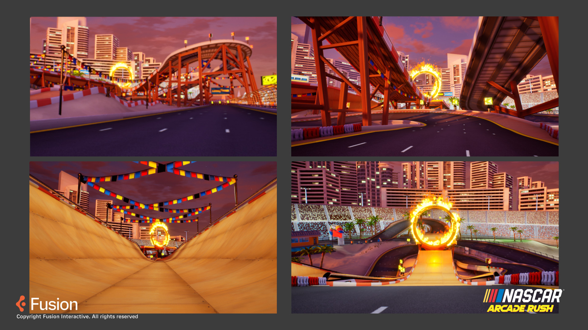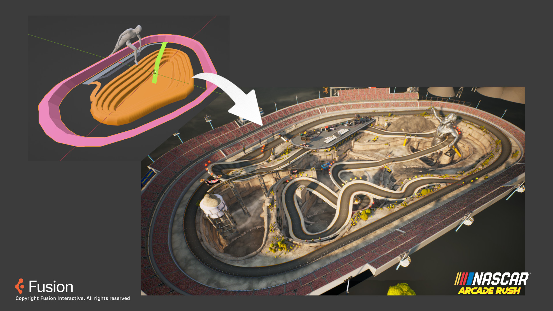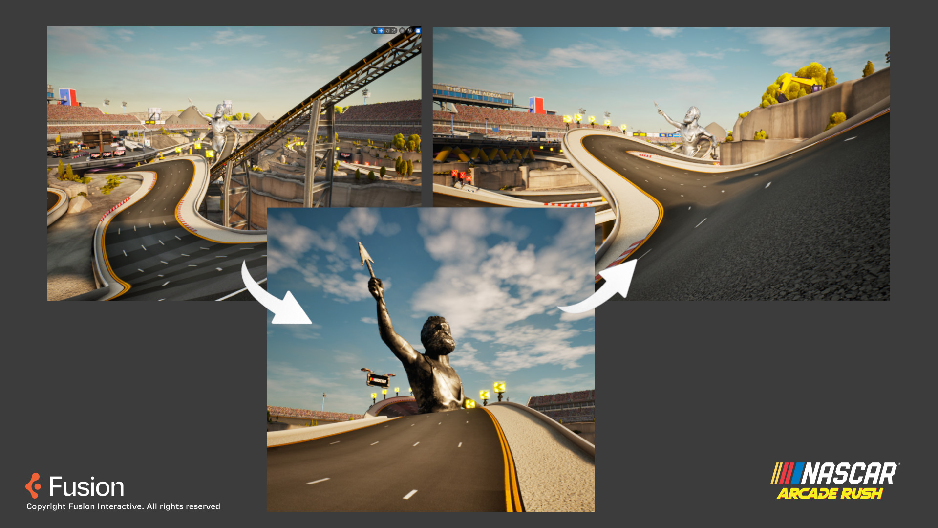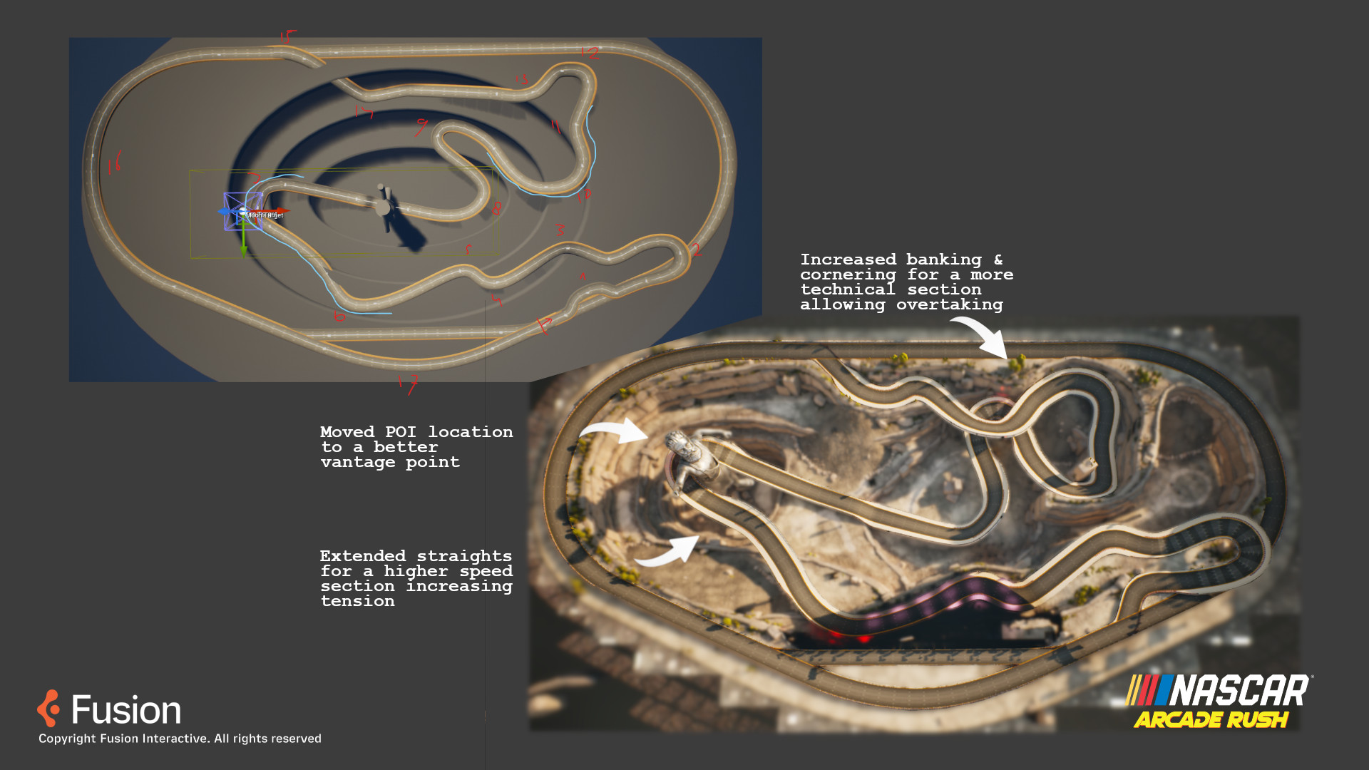 - Establishing the intended racing experiences, POI’s and NASCAR recognizable elements per track based upon research into their real-life counterparts.